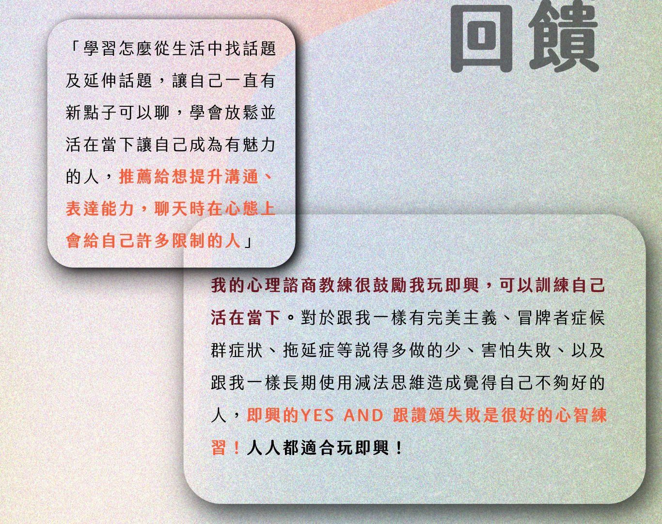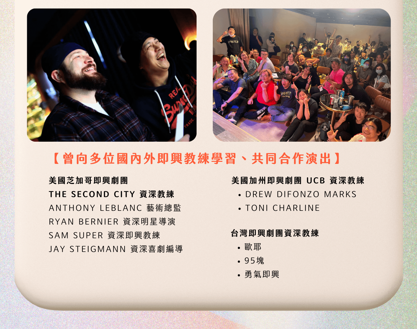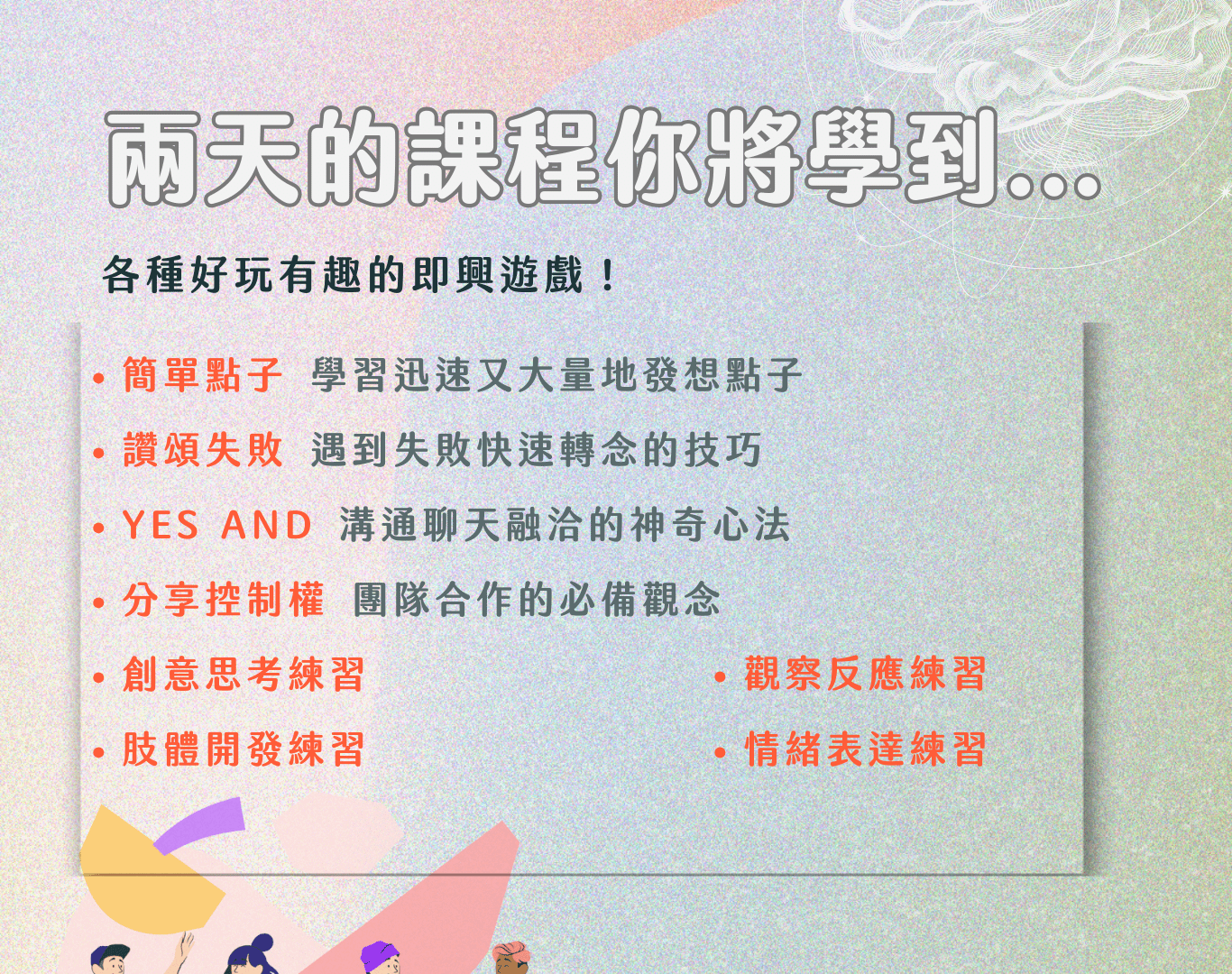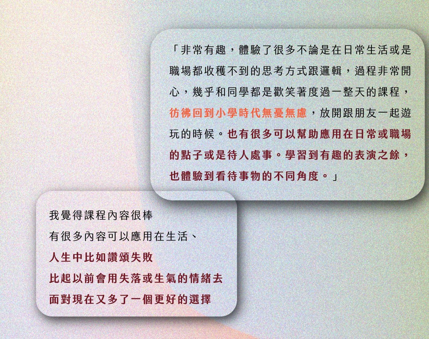 眾多學員激推的即興表演入門課:師承國際知名劇團 The Second City 系統,透過好玩的遊戲與練習,讓你釋放壓力、提升溝通自信。不需要任何表演經驗,就能體驗「Yes, And」的魔力!【Apple、Microsoft、Google、Disney、Pixar 等全球知名企業都採用的訓練系統】